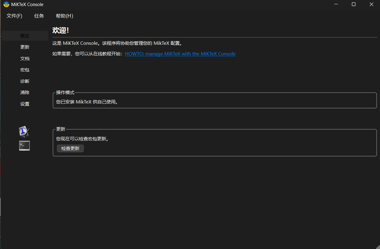 如若后续在vscode中使用 lateX 时,显示部分宏包未安装,那么就可通过命令行来更新MikTex: