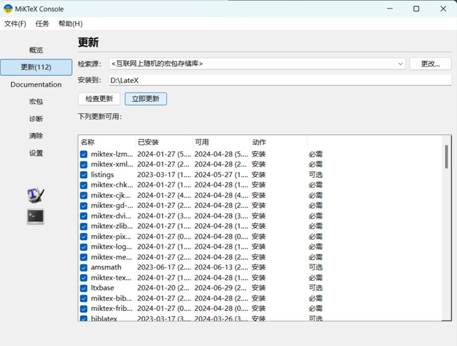 miktex-console --update运行命令后会出现如下界面,点击立即更新即可,后续便可正常在vscode中使用LateX了。