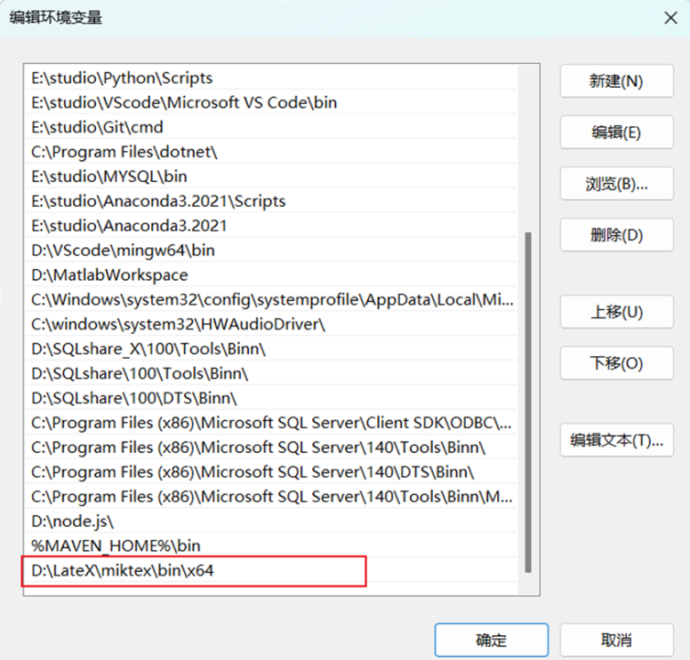 (3)在“系统变量”中找到并选择 Path 变量,然后点击“新建”,将(1)中复制的地址粘贴进去,然后点击确定并保存,至此,LaTeX就安装并配置成功了。